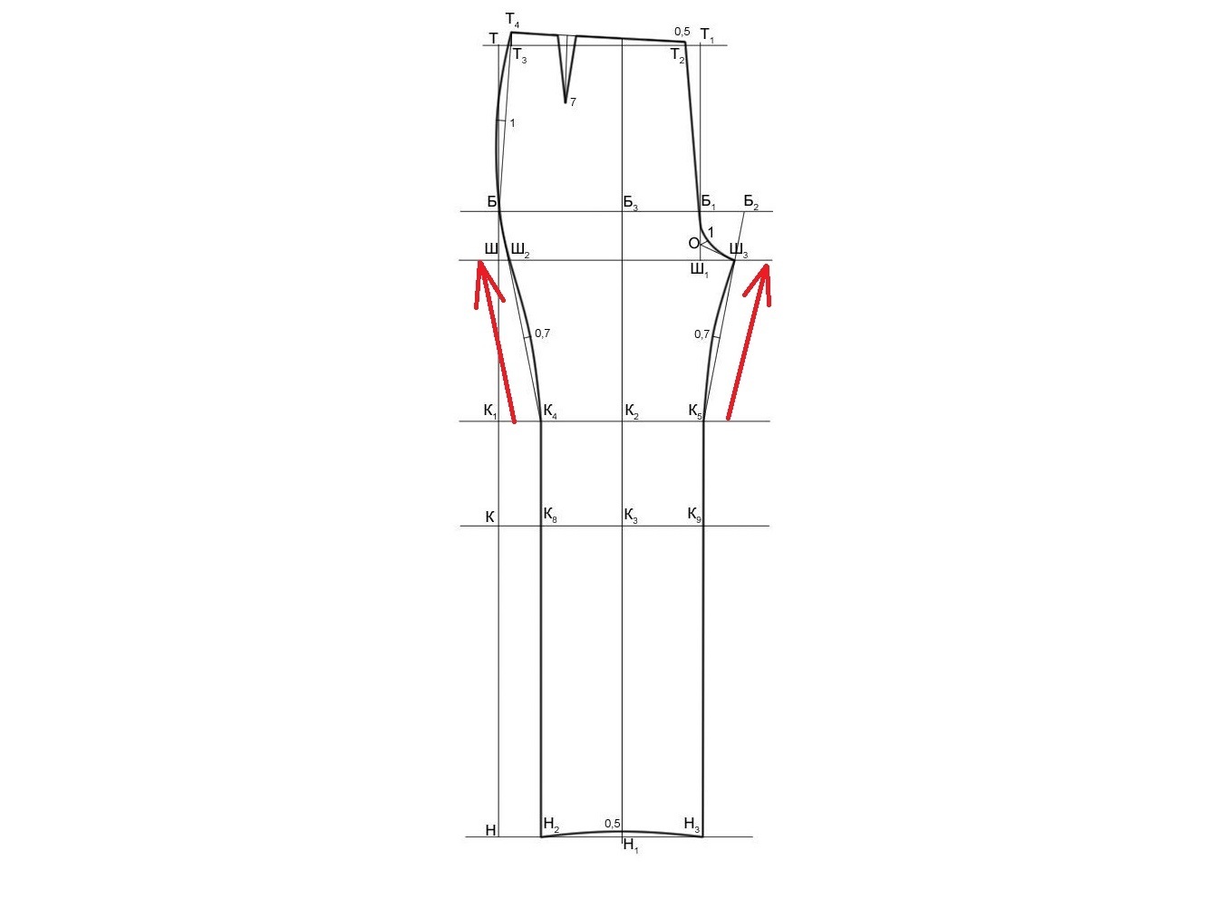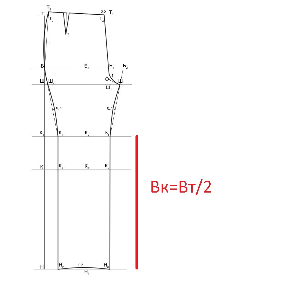 Линию колена нужно проводить через центр колена при построении узких брюк.