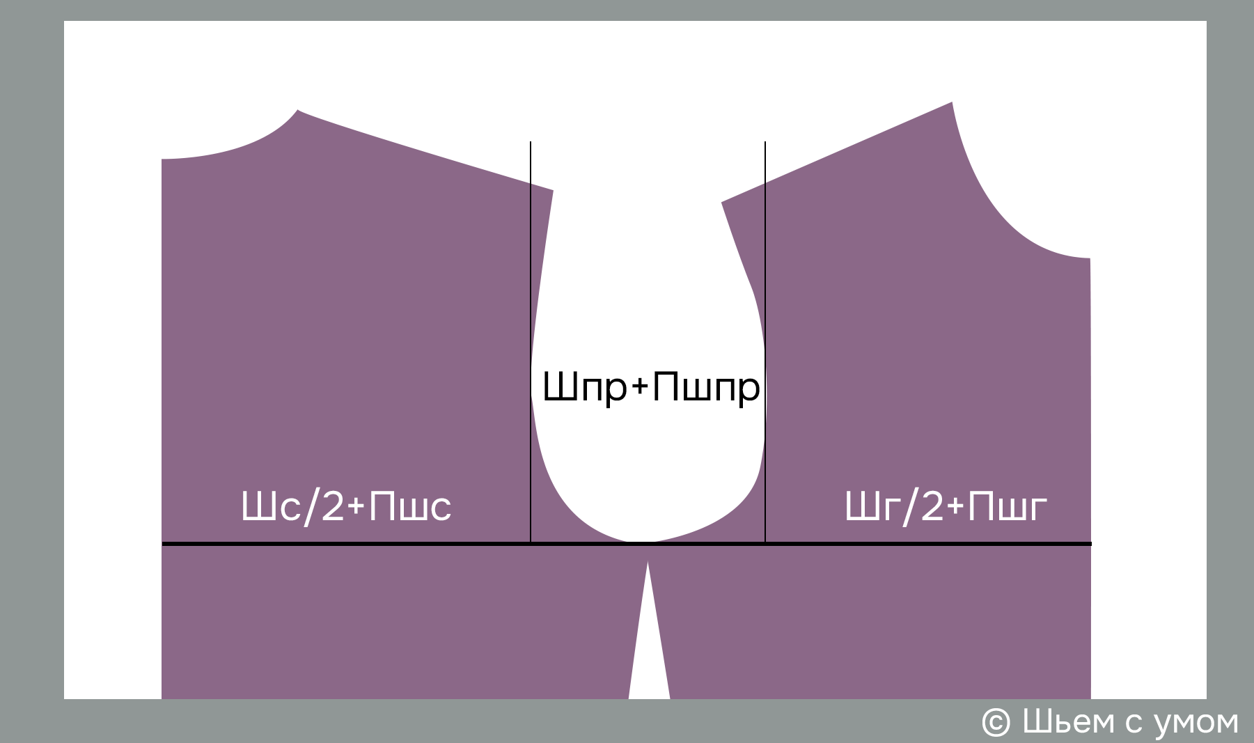 Пройма присутствует на чертеже полностью, поэтому и прибавка к ширине проймы указывается к полной ширине проймы.